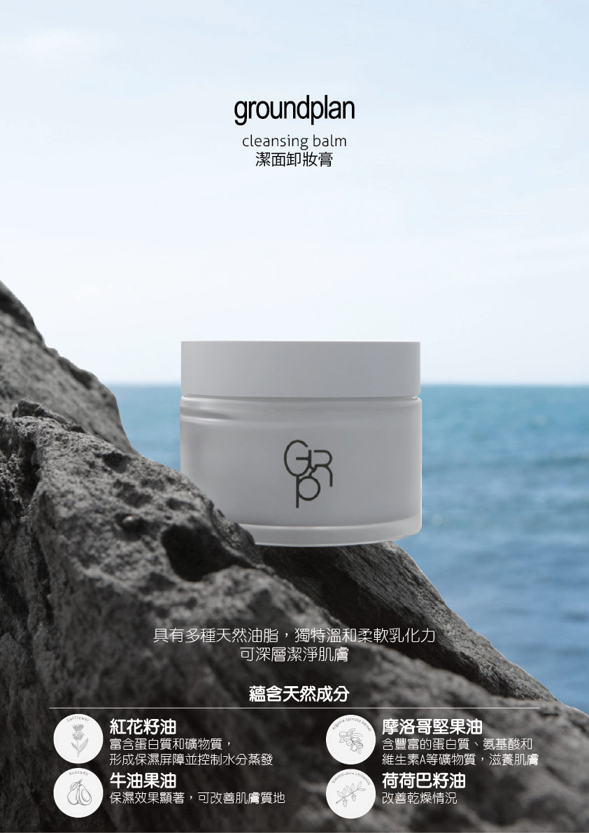 groundplan 潔面卸妝膏,一體式全效配方,含六種天然植物油,溫和溶解彩妝與皮脂,還能同步保濕修護肌膚,帶來潔淨與柔嫩雙重感受。