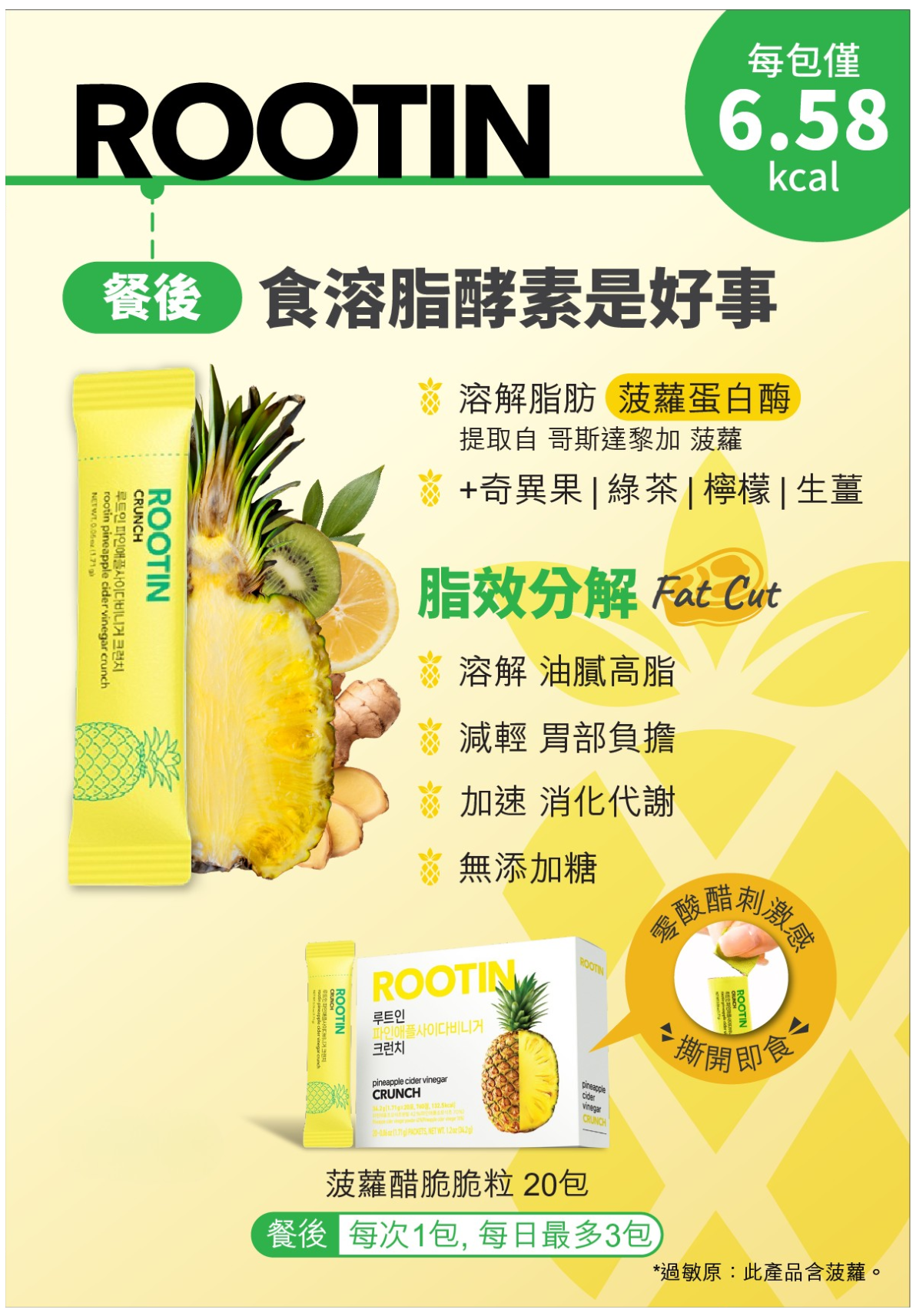 主要成份:菠蘿蛋白酶,奇異果 ,綠茶,檸檬,生薑